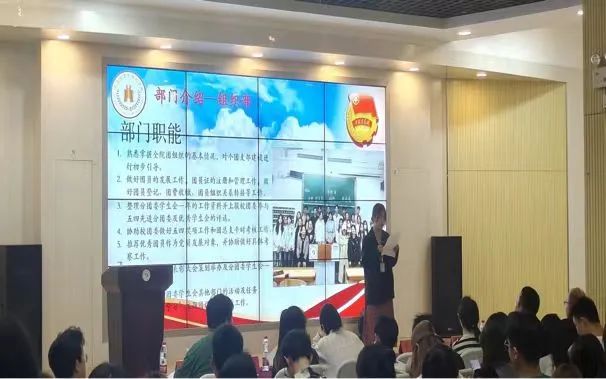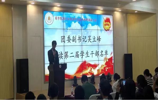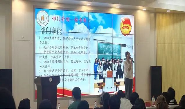 会议接下来由学生会主席团代表吴立峰宣读新一任主席团、各部部长名单,并由各个部门部长总结介绍各部门职能,让新干事们更好的了解自己接下来的工作。